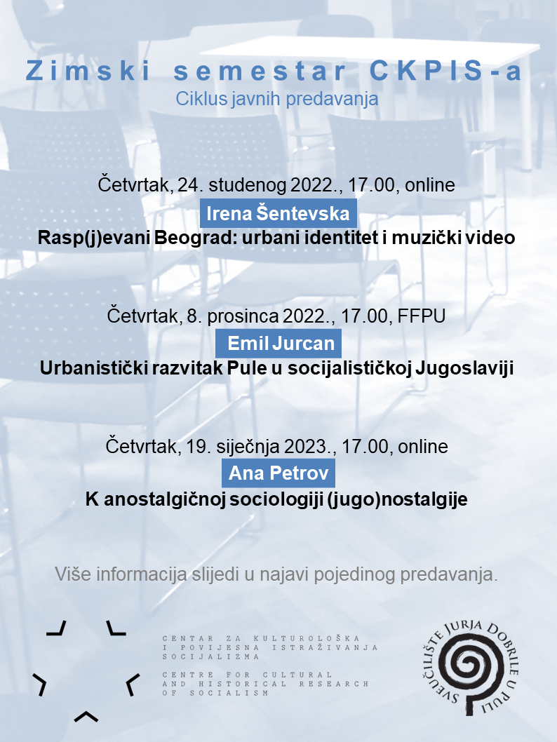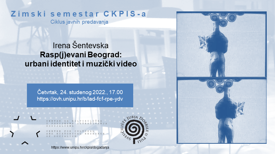 Ciklus javnih predavanja Zimski semestar CKPIS-a u ovoj akademskoj godini otvara teoretičarka umjetnosti i medija Irena Šentevska. Predavanje pod naslovom Rasp(j)evani Beograd: urbani identitet i muzički video autorica istoimene monografije održat će u četvrtak, 24. studenog 2022., u 17.00 sati u virtualnoj dvorani https://ovh.unipu.hr/b/lad-fcf-rpe-ydv.