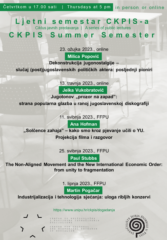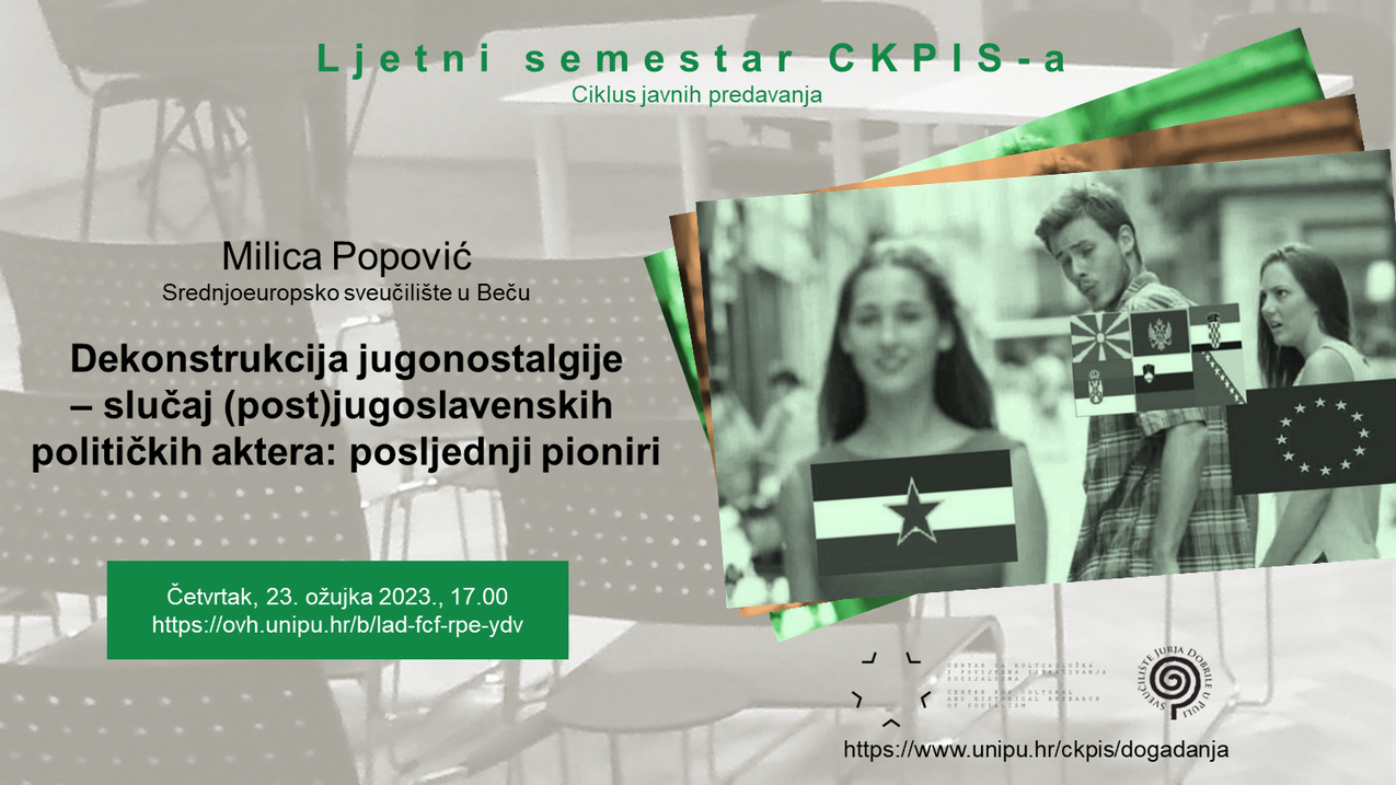 Ciklus predavanja Ljetni semestar CKPIS-a otvara Milica Popović sa Srednjoeuropskog sveučilišta u Beču, koja će govoriti na temu Dekonstrukcija jugonostalgije – slučaj (post)jugoslavenskih političkih aktera: posljednji pioniri. Predavanje će biti održano isključivo online u četvrtak, 23. ožujka 2023., u 17.00 sati u virtualnoj dvorani https://ovh.unipu.hr/b/lad-fcf-rpe-ydv.