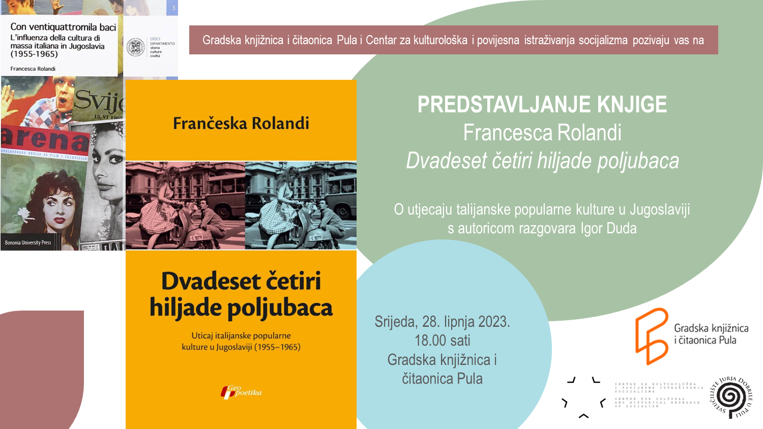 U suorganizaciji Gradske knjižnice i čitaonice Pula i CKPIS-a u srijedu, 28. lipnja 2023., u 18.00 sati u Gradskoj knjižnici i čitaonici održat će se predstavljanje knjige Dvadeset četiri hiljade poljubaca. Uticaj italijanske popularne kulture u Jugoslaviji (1955-1965) (Geopoetika, Beograd, 2022.), srpskoga prijevoda talijanskog izvornika Con ventiquattromila baci. L'influenza della cultura di massa italiana in Jugoslavia (1955-1965) (Bononia University Press, Bologna, 2015.). Autorica Francesca Rolandi za ovo je djelo 2014. od Sveučilišta u Bologni dobila Nagradu Vinka Kitarović. S autoricom će o utjecaju talijanske popularne kulture u Jugoslaviji razgovarati Igor Duda sa Sveučilišta Jurja Dobrile u Puli. [Radio Rojc, Kulturistra]