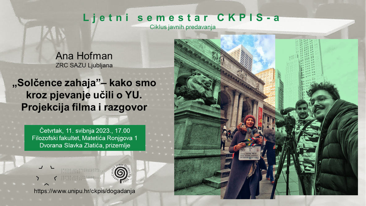 Ciklus javnih predavanja Ljetni semestar CKPIS-a nastavlja se gostovanjem etnomuzikologinje i antropologinje Ane Hofman sa Slovenske akademije znanosti i umjetnosti. Program pod naslovom Solčence zahaja – kako smo kroz pjevanje učili o YU uključuje projekciju dokumentarnog filma i razgovor, a održat će se u četvrtak, 11. svibnja 2023., u 17.00 sati u Dvorani Slavka Zlatića, u prizemlju Filozofskog fakulteta u Puli, Matetića Ronjgova 1.