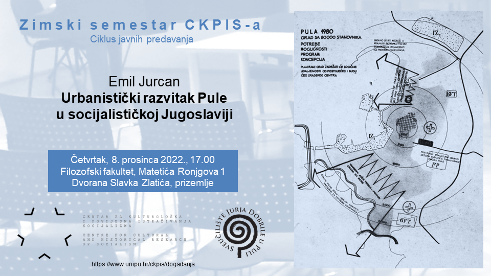 Ciklus javnih predavanja Zimski semestar CKPIS-a nastavlja arhitekt i urbanist Emil Jurcan temom Urbanistički razvitak Pule u socijalističkoj Jugoslaviji. Predavanje će se održati u četvrtak, 8. prosinca 2022., u 17.00 sati u Dvorani Slavka Zlatića, u prizemlju Filozofskog fakulteta u Puli, Matetića Ronjgova 1. [VIDEO] [Radio Rojc] [Istra24] [GlasIstrePDF]
