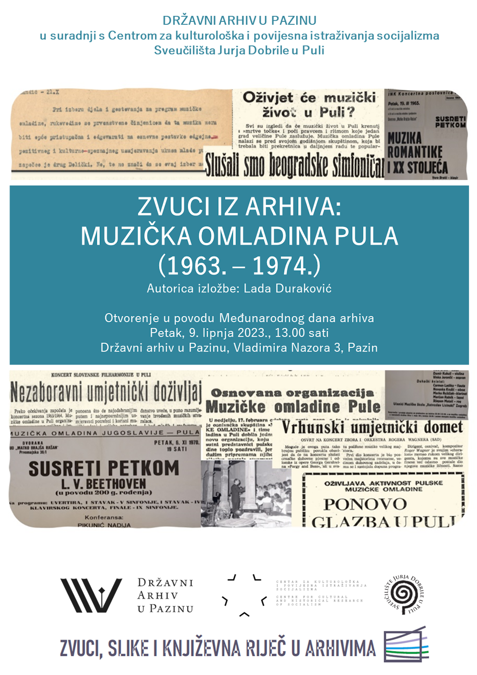 U povodu Međunarodnog dana arhiva, 9. lipnja 2023. u 13.00 sati u Državnom arhivu u Pazinu bit će otvorena dokumentarna izložba pod nazivom Zvuci iz arhiva: Muzička omladina Pula (1963. – 1974.). Izložbom će se obilježiti šezdeseta obljetnica osnivanja pulske podružnice Muzičke omladine. Posvećena je iznimnim rezultatima ostvarenim u prvom desetljeću njezina rada, a sadrži arhivsko gradivo (dokumente, plakate, fotografije, članke) koje se čuva u Državnom arhivu u Pazinu, Sveučilišnoj knjižnici u Puli, Povijesnom i pomorskom muzeju Istre te u Arhivu Hrvatske glazbene mladeži u Zagrebu. Autorica je izložbe Lada Duraković, a nastala je u suradnji Državnog arhiva u Pazinu i Centra za kulturološka i povijesna istraživanja socijalizma Sveučilišta Jurja Dobrile u Puli.