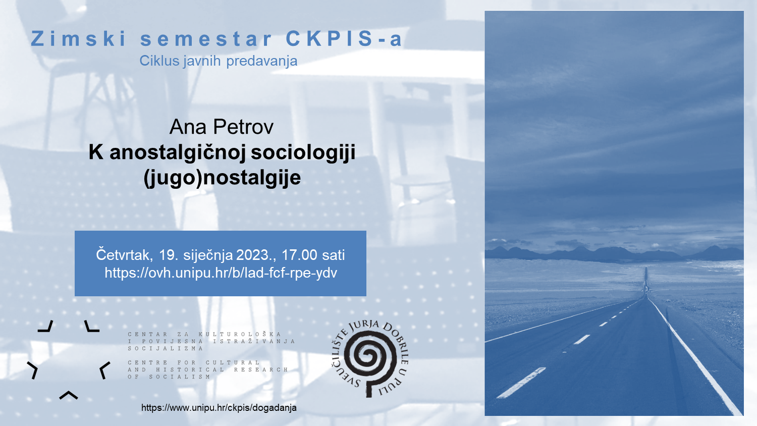 Treća gošća Zimskog semestra CKPIS-a je muzikologinja i sociologinja Ana Petrov s Fakulteta za medije i komunikacije u Beogradu. Predavanje pod naslovom K anostalgičnoj sociologiji (jugo)nostalgije održat će u četvrtak, 19. siječnja 2023., u 17.00 sati u virtualnoj dvorani https://ovh.unipu.hr/b/lad-fcf-rpe-ydv.