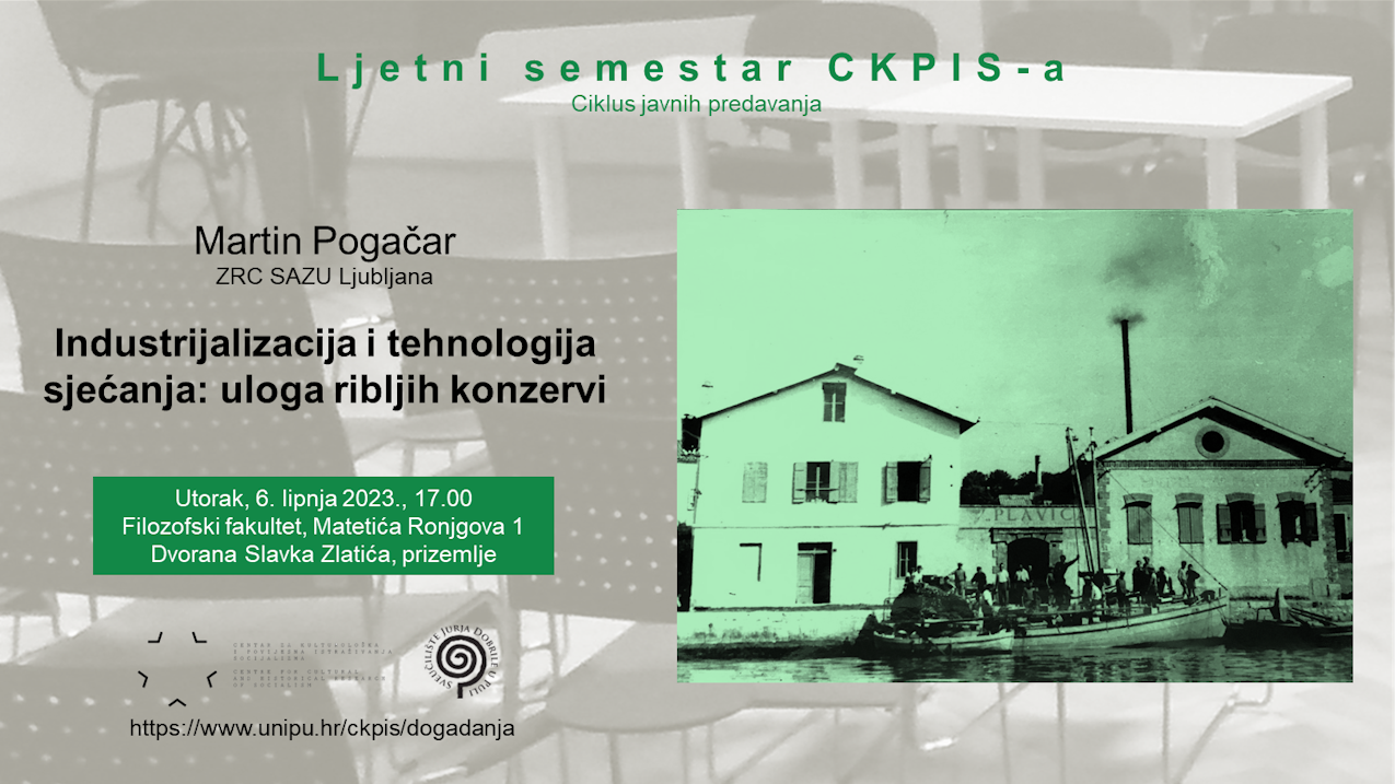 Posljednji gost ciklusa javnih predavanja Ljetni semestar CKPIS-a je Martin Pogačar sa Slovenske akademije znanosti i umjetnosti. Predavanje pod naslovom Industrijalizacija i tehnologija sjećanja: uloga ribljih konzervi održat će u utorak, 6. lipnja 2023., u 17.00 sati u Dvorani Slavka Zlatića, u prizemlju Filozofskog fakulteta u Puli, Matetića Ronjgova 1.