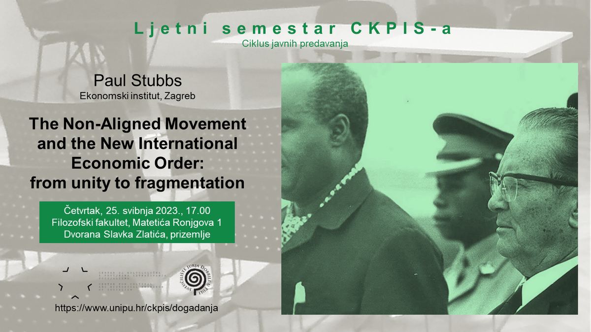 Isprva usredotočen na pitanja političke suverenosti i globalne (ne)sigurnosti, Pokret nesvrstanih (NAM) je 1970-ih otvorio mnoga ekonomska pitanja zagovarajući cjelovitu preobrazbu međunarodnog gospodarskog sustava temeljenog na neokolonijalizmu i sustavnom iskorištavanju periferije od strane jezgre. Do 1974. i njegova usvajanja aklamacijom na Općoj skupštini UN-a NAM je, uz skupinu G-77 i Konferenciju Ujedinjenih naroda za trgovinu i razvoj (UNCTAD), imao ključnu ulogu u formuliranju novog međunarodnog ekonomskog poretka (NIEO). Predavanje prikazuje nastanak i sudbinu NIEO-a, fokusirajući se na ulogu Pokreta nesvrstanih i njegovih vodećih članica te na poteškoće u održavanju jedinstva Globalnog juga, osobito nakon druge naftne krize 1979. godine.