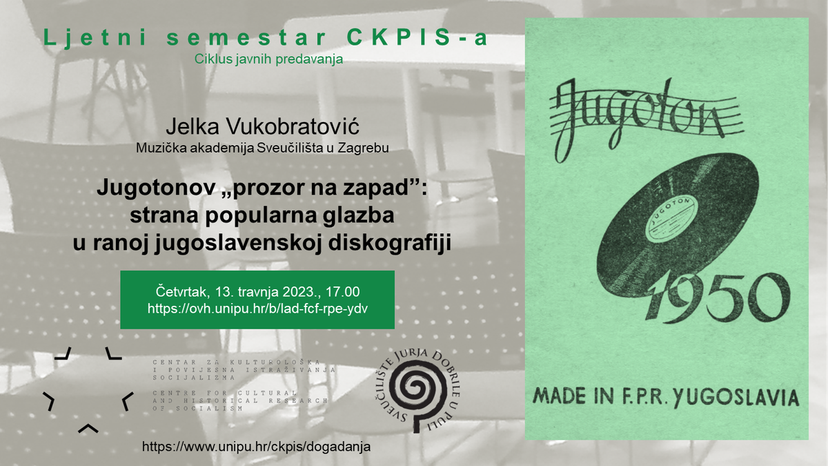 Druga gošća Ljetnog semestra CKPIS-a je Jelka Vukobratović, etnomuzikologinja i docentica na Odsjeku za muzikologiju Muzičke akademije Sveučilišta u Zagrebu, koja će govoriti na temu Jugotonov „prozor na zapad“: strana popularna glazba u ranoj jugoslavenskoj diskografiji. Predavanje će biti održano isključivo online u četvrtak, 13. travnja 2023., u 17.00 sati u virtualnoj dvorani https://ovh.unipu.hr/b/lad-fcf-rpe-ydv.