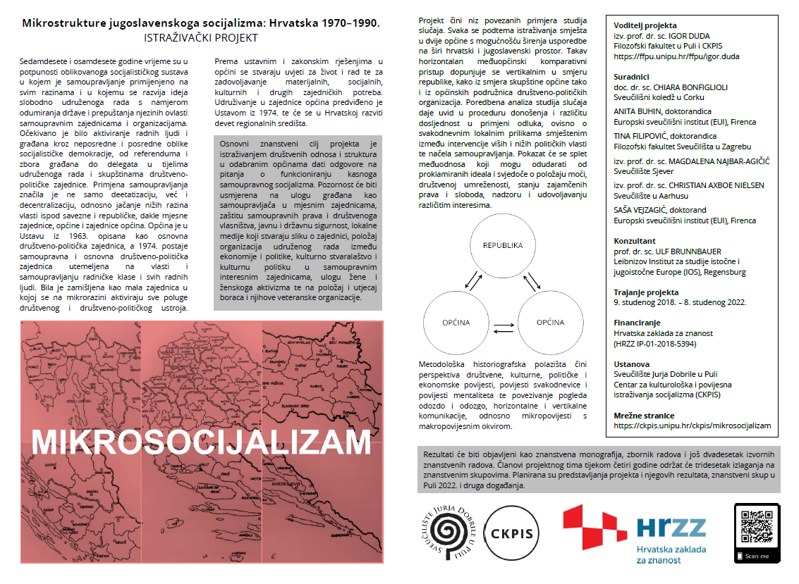 Sedamdesete i osamdesete godine vrijeme su u potpunosti oblikovanoga jugoslavenskog socijalističkog sustava u kojem je samoupravljanje primijenjeno na svim razinama s namjerom odumiranja države i prepuštanja njezinih ovlasti samoupravnim zajednicama i organizacijama. Općina je bila zamišljena kao zajednica u kojoj se na mikrorazini aktiviraju sve poluge društveno-političkog ustroja. Osnovni znanstveni cilj projekta je istraživanjem društvenih odnosa i struktura u odabranim općinama dati odgovore na pitanja o funkcioniranju kasnoga socijalizma. Pozornost će biti usmjerena na ulogu građana kao samoupravljača u mjesnim zajednicama, zaštitu samoupravnih prava i društvenoga vlasništva, javnu i državnu sigurnost, lokalne medije koji stvaraju sliku o zajednici, položaj organizacija udruženog rada između ekonomije i politike, kulturno stvaralaštvo i kulturnu politiku u samoupravnim interesnim zajednicama, ulogu žene i ženskoga aktivizma te na položaj i utjecaj boraca i njihove veteranske organizacije. Poredbena analiza studija slučaja daje uvid u splet međuodnosa koji svjedoče o položaju moći, društvenoj umreženosti, stanju zajamčenih prava i sloboda, nadzoru i udovoljavanju različitim interesima. Metodološki pristup proizlazi iz perspektive društvene, kulturne, političke i ekonomske povijesti, povijesti svakodnevice i mentaliteta te povezivanja pogleda odozdo i odozgo, horizontalne i vertikalne komunikacije, odnosno mikropovijesti s makropovijesnim okvirom. Rezultati će biti objavljeni kao znanstvena monografija, zbornik radova i još dvadesetak izvornih znanstvenih radova.
