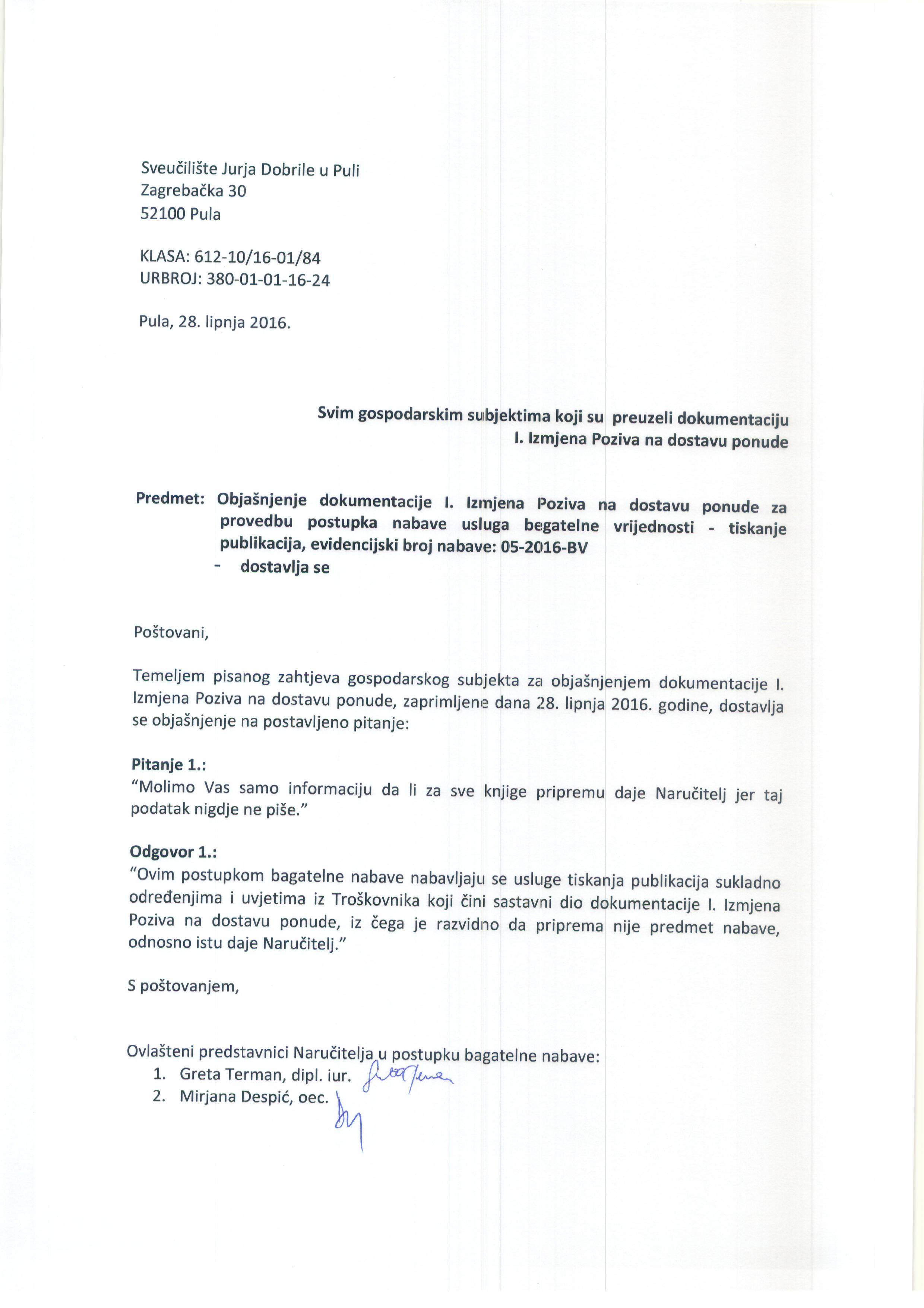 Sukladno odredbi članka 80. stavka 2. točke 1. Zakona o javnoj nabavi (NN 120/16, 114/222), Sveučilište Jurja Dobrile u Puli objavljuje popis gospodarskih subjekata s kojima su predstavnici Sveučilišta iz članka 76. stavka 2. točke 1. Zakona o javnoj nabavi (NN 120/2016, 114/22) ili s njima povezane osobe sukladno Članku 77. Zakona o javnoj nabavi (NN 120/16, 114/22), u sukobu interesa: