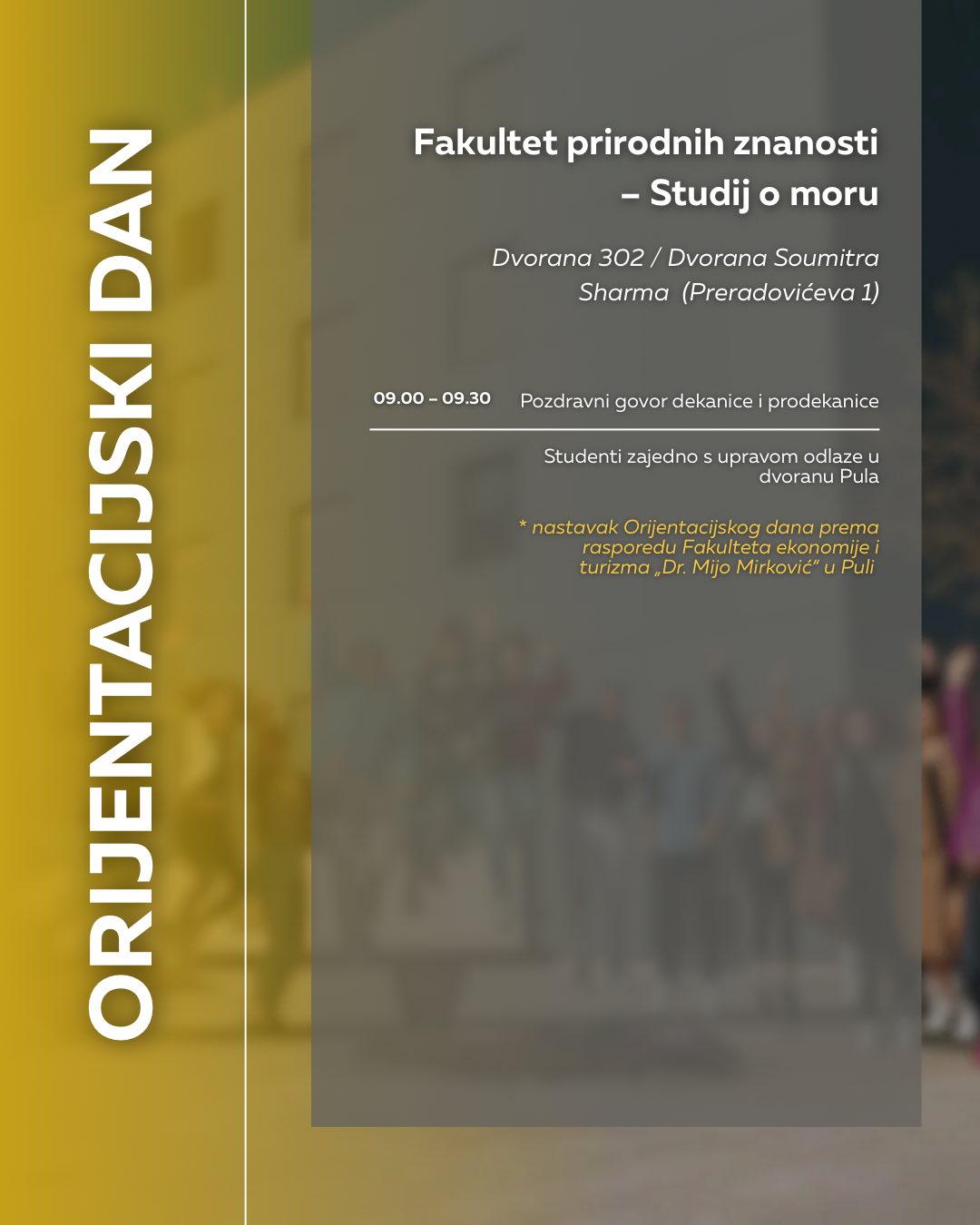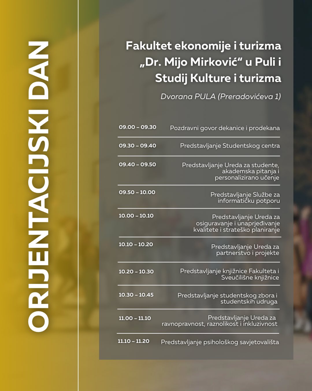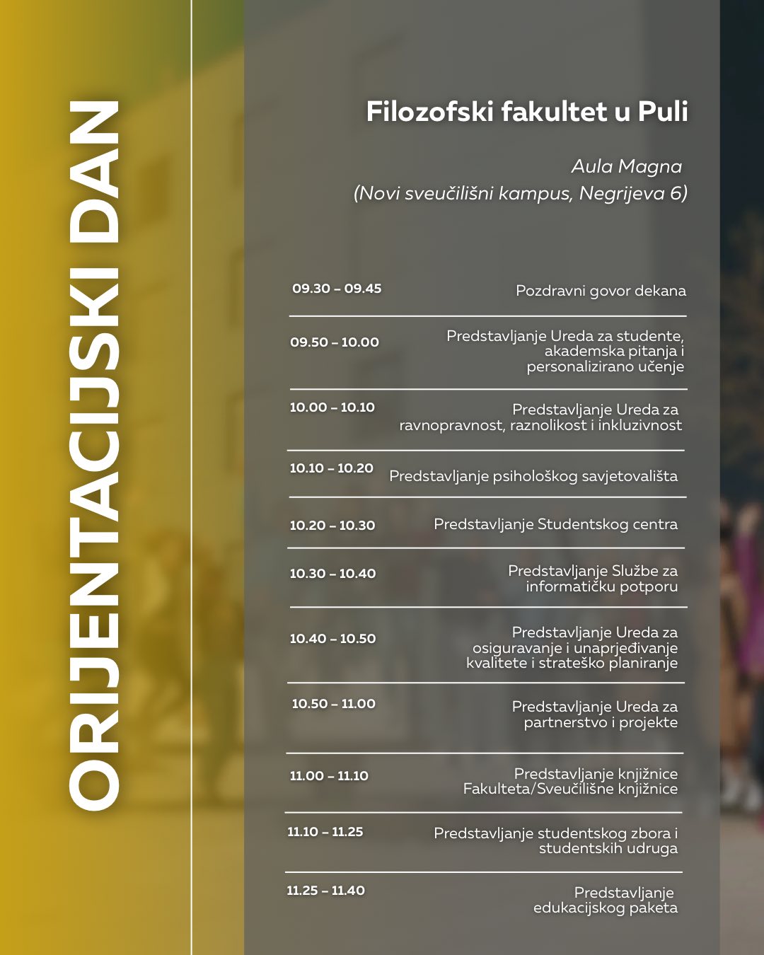 NAPOMENA: Obratite pozornost na adrese događaja, za pojedine fakultete Orijentacijski će se dan održati u novom kampusu na adresi Negrijeva 6, gdje se nastava tih fakulteta i izvodi.